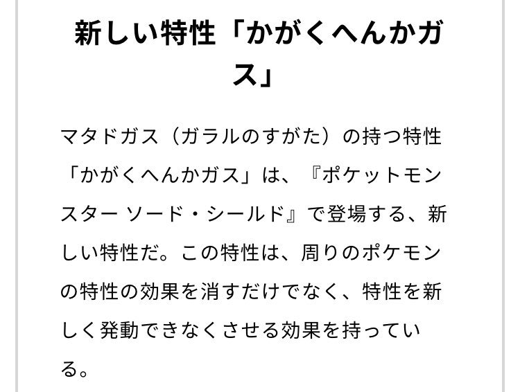 レジギガスってダブルでドガスと組ませて化学変化ガスでスロースターター消せるのかしら 329 名無しのポケモントレーナー (水) ID79MFd42W0 化学変化ガスを吸っても特性が失われず、アストラルビッドが強力すぎてダイマしないほうが強い場面も多い。マタドガスが弱点とするエスパータイプにも強い。 ランドロス ランドロス(霊獣) マタドガスに飛んでくる地面技を透かしながら威嚇を撒ける。 ガラルマタドガスの新特性『かがくへんかガス』が公開され、特性を封じる特性を判明しました。 この記事では公開されたかがくへんかガスの考察をまとめていきます。 特性を無効化する新特性「かがくへんかガス」 ガラル地方には、他の地方にはない特性を持つポケモンたちが多数生息